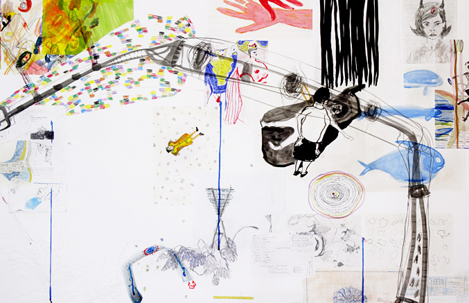 Bleistift, Buntstift, Tusche, Acryl, Ölkreide auf Papier
