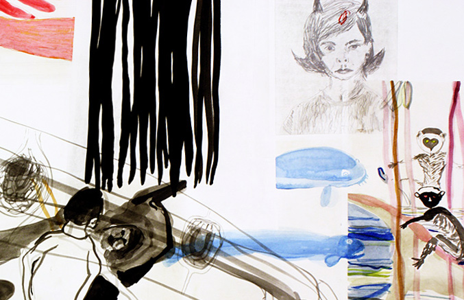 Bleistift, Buntstift, Tusche, Acryl, Ölkreide auf Papier