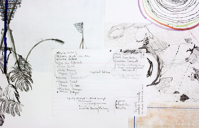 Bleistift, Buntstift, Tusche, Acryl, Ölkreide auf Papier
